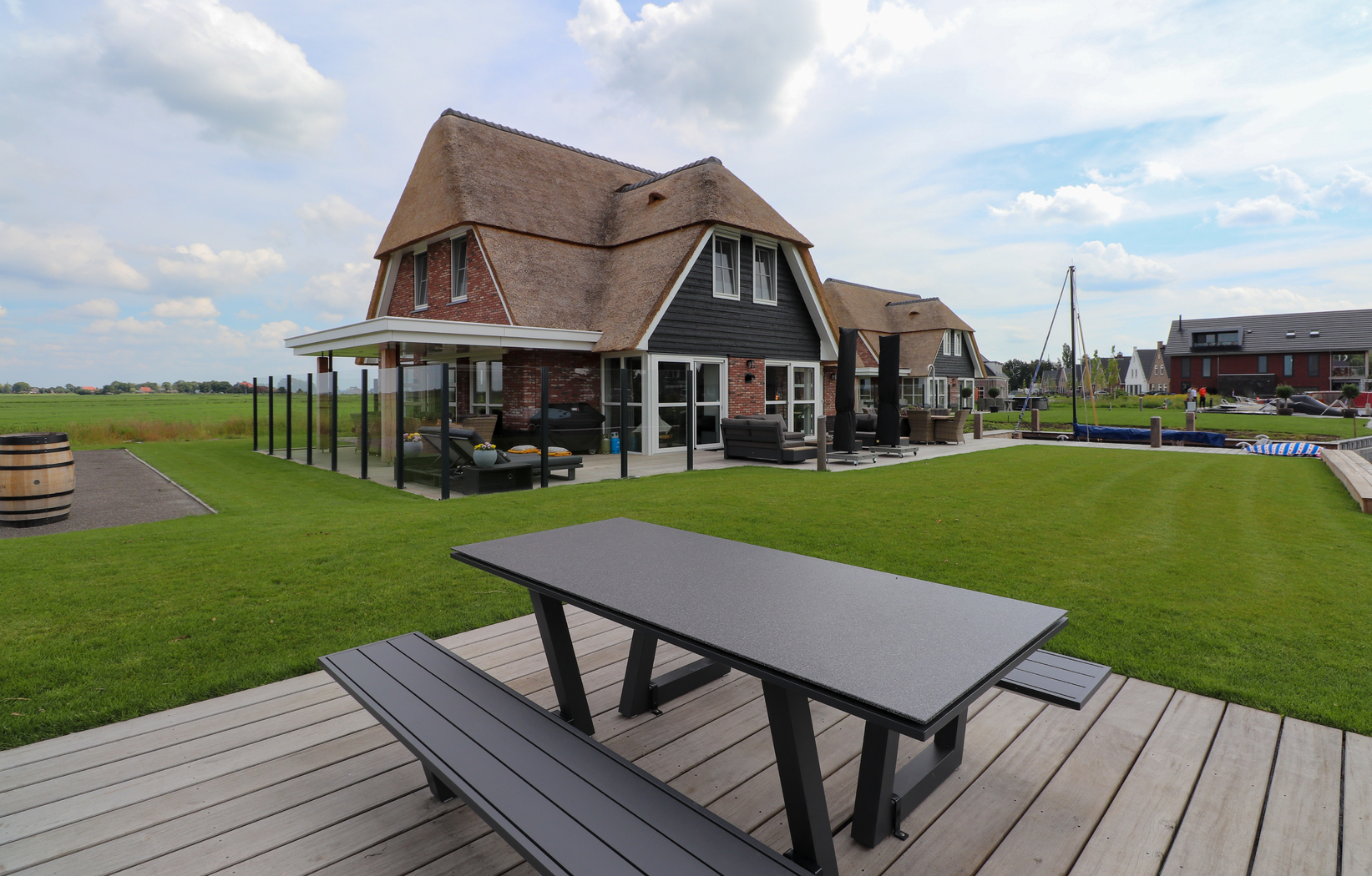 Buiten leef je in het ritme van het water. Vanaf de eigen aanlegsteiger kun je direct het Tjeukemeer opvaren, zwemmen of een hengeltje uitgooien. De verlaagde steiger met zwemtrap, buitendouche en picknicktafel maken het buitenleven helemaal compleet. Ook aan gezelligheid geen gebrek: er is een eigen jeu-de-boulesbaan, een grote loungebank en ligbedden om te ontspannen in de zon. Neem zeker je fietsen mee – de omgeving van Delfstrahuizen is prachtig en via de fietspaden ontdek je de Friese meren op je eigen tempo.