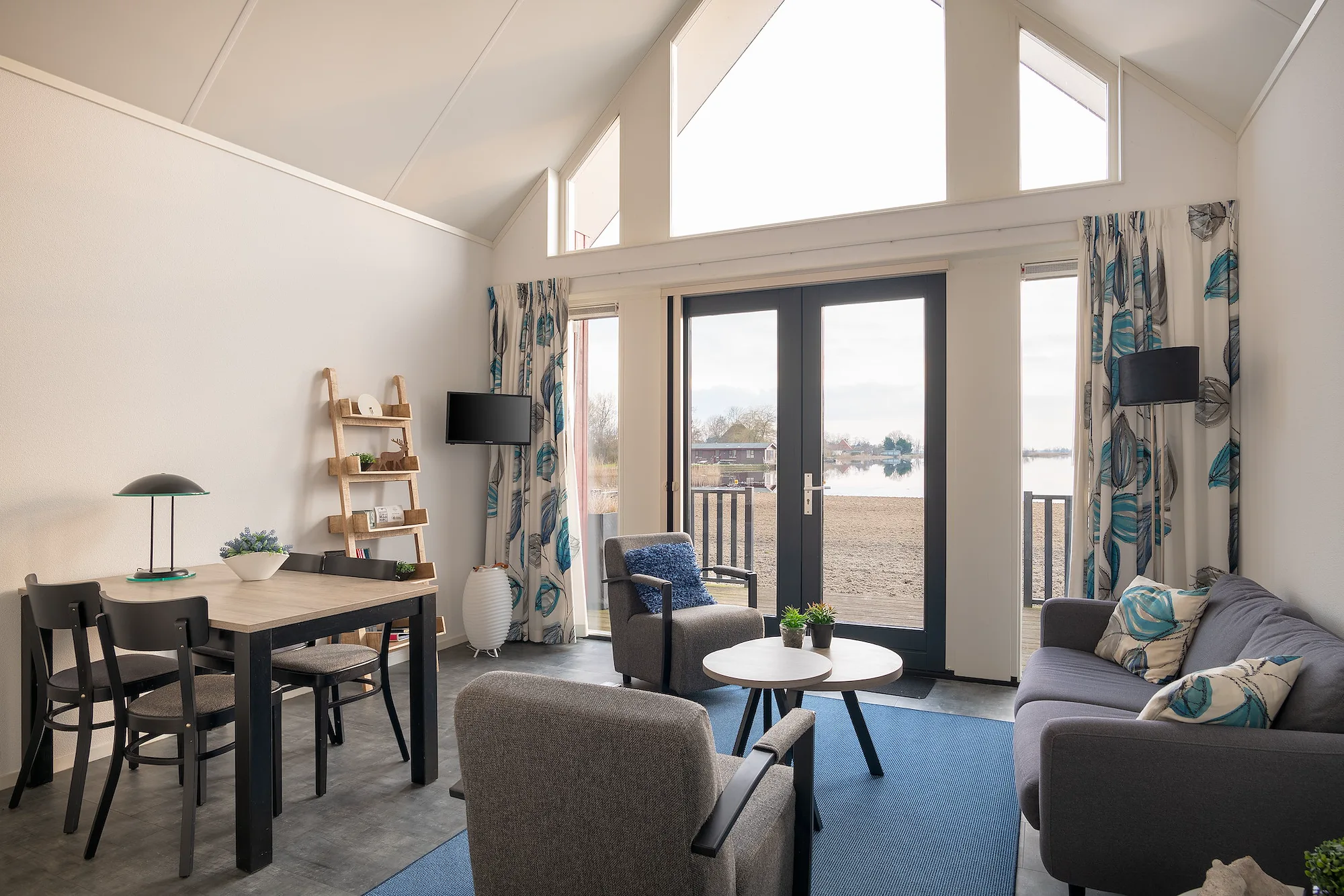 De Strandlodge Duin is geschikt voor 4 personen en heeft twee slaapkamers, waarvan één op de begane grond – handig als je met kleine kinderen of je ouders reist. De woonkamer is licht en comfortabel ingericht met een zithoek, eethoek en vloerverwarming, zodat je ook op koelere dagen prettig verblijft. De open keuken is compleet uitgerust met onder andere een combi-oven, koelkast met vriesvak en koffiezetapparaat. Via de openslaande deuren stap je zo het gemeubileerde terras op, dat direct grenst aan het zandstrand. Ideaal voor wie houdt van een frisse duik of gewoon met de voeten in het zand wil ontspannen. Neem gerust je fietsen mee, want in de omgeving kun je prachtig toeren door Nationaal Park Weerribben-Wieden of langs de Friese meren.