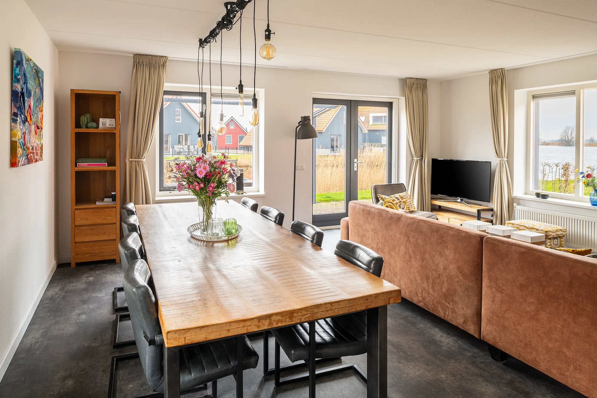 Als je verblijft in Watervilla Brasem, geniet je van alle gemakken van thuis – maar dan met het water letterlijk aan je voeten. De woonkamer is modern ingericht met een gezellige zithoek en een eethoek waar je met z’n allen kunt tafelen. De open keuken is goed uitgerust met een combi-oven, vaatwasser en koffiezetapparaat. Op de begane grond vind je een slaapkamer met twee boxsprings en een badkamer met douche en toilet, ideaal als iemand slecht ter been is. Boven zijn er nog twee slaapkamers en een tweede badkamer. Alles voelt ruim, licht en comfortabel aan, precies wat je zoekt tijdens een ontspannen vakantie in Friesland.