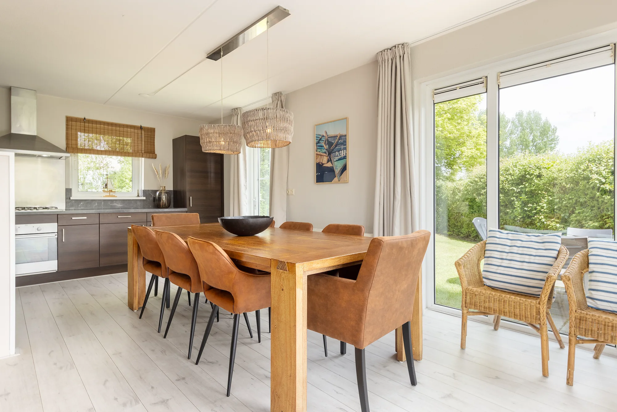 Als je hier verblijft, ervaar je het echte Friese buitenleven. De Wellness Wiid Plus 8 is vrijstaand, heeft een ruime tuin en ligt pal aan het water, met een eigen steiger voor je boot of supboard. Binnen vind je een gezellige woonkamer met flatscreen-tv en eethoek, en een open keuken met combimagnetron, vaatwasser, waterkoker en filterkoffiezetapparaat – alles wat je nodig hebt voor een comfortabel verblijf. Op de begane grond ligt één slaapkamer met twee eenpersoons boxspringbedden en een moderne badkamer met douche en Finse sauna. Handig: er is ook een apart toilet beneden. Boven vind je nog twee slaapkamers met elk comfortabele boxsprings en een tweede badkamer met douche en toilet. Vergeet niet je badjas mee te nemen voor de buitenspa!
