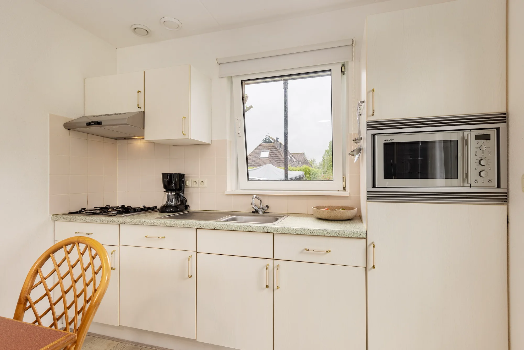 Als je met het gezin in de Wetterbungalow 6 verblijft, geniet je van een praktische indeling en gezellige sfeer. De woonkamer heeft een comfortabele zithoek met televisie en een sfeervolle bedstee — een knusse slaapplek voor twee volwassenen of juist een favoriete plek voor de kinderen. De open keuken is compleet ingericht met onder andere een koelkast met vriesvak, combimagnetron, filterkoffiezetapparaat en vaatwasser. Op de begane grond vind je ook de badkamer met bad, douche en wastafel, plus een apart toilet. Boven zijn twee slaapkamers, beide voorzien van twee eenpersoonsbedden en een eigen wastafel. Buiten kun je heerlijk zitten op het gemeubileerde terras met parasol, direct aan het water. Vergeet niet om je fietsen mee te nemen: de omgeving is prachtig om te verkennen!